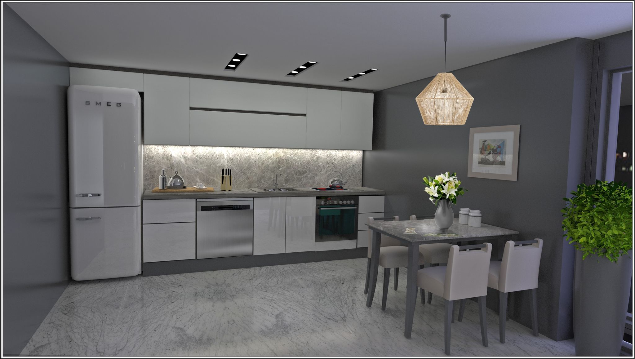 - آشپزخانه توکار با اجاق گاز، هود و فر