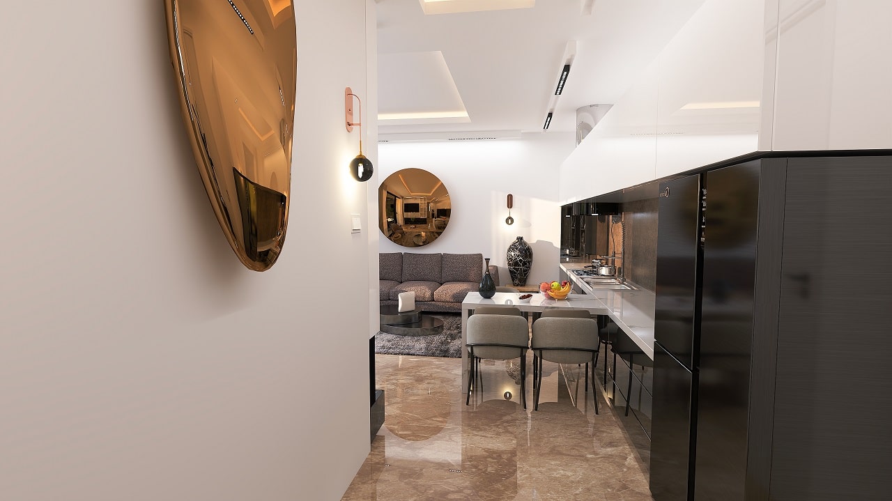 - آشپزخانه اوپن با مبلمان توکار