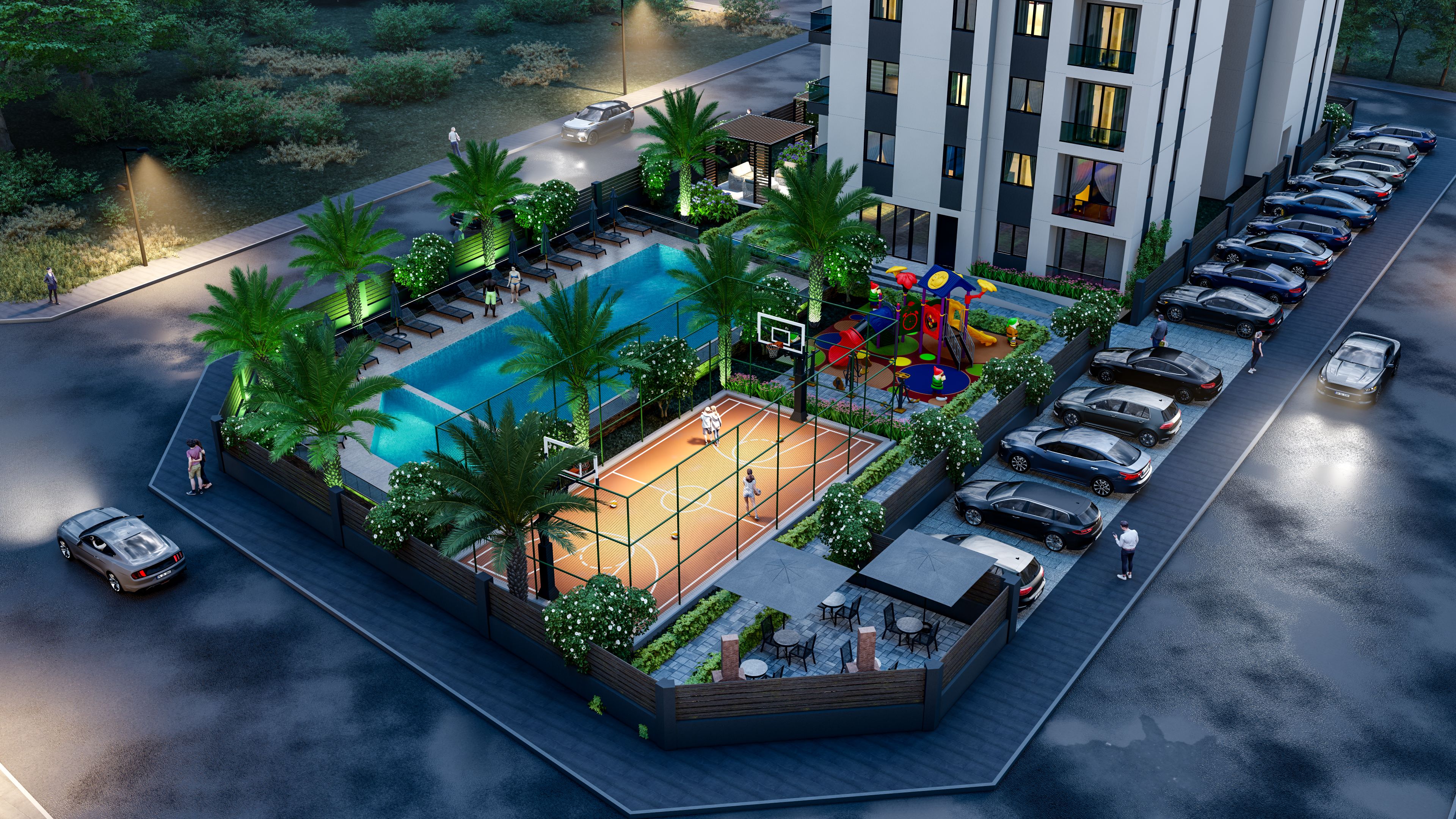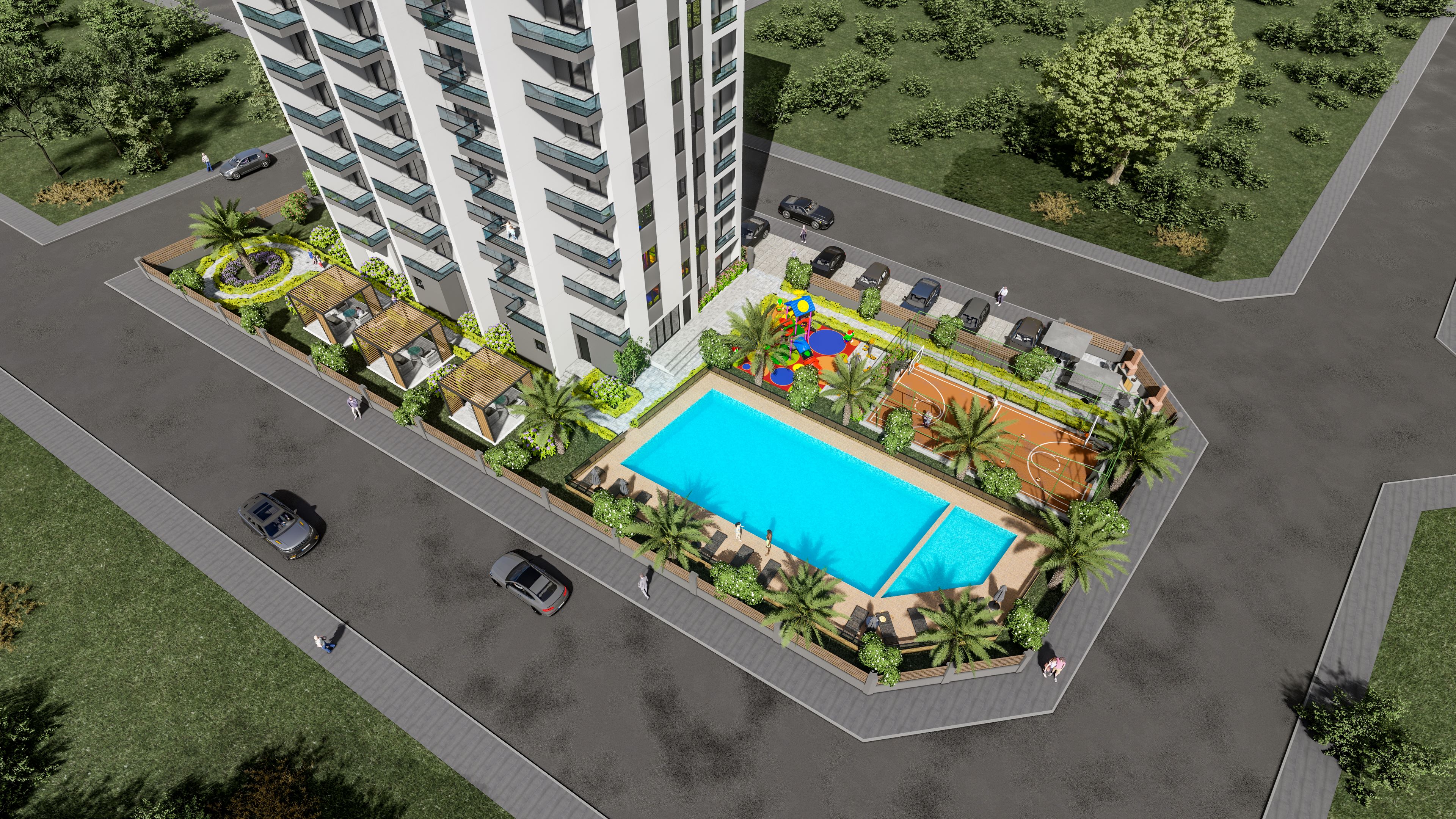- استخر، زمین بازی کودک و زمین بسکتبال