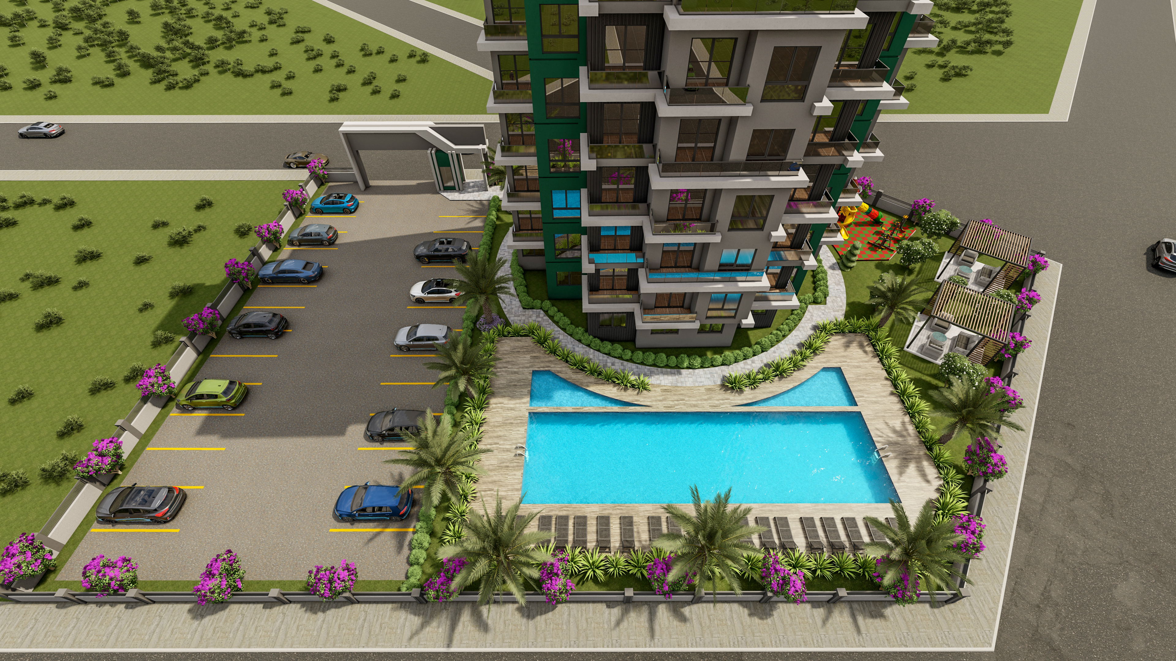 استخر شنا، پارکینگ بیرونی. زمین بازی بچهها در فضای باز. حمام ترکی، سونا، و بدنسازی درونی.