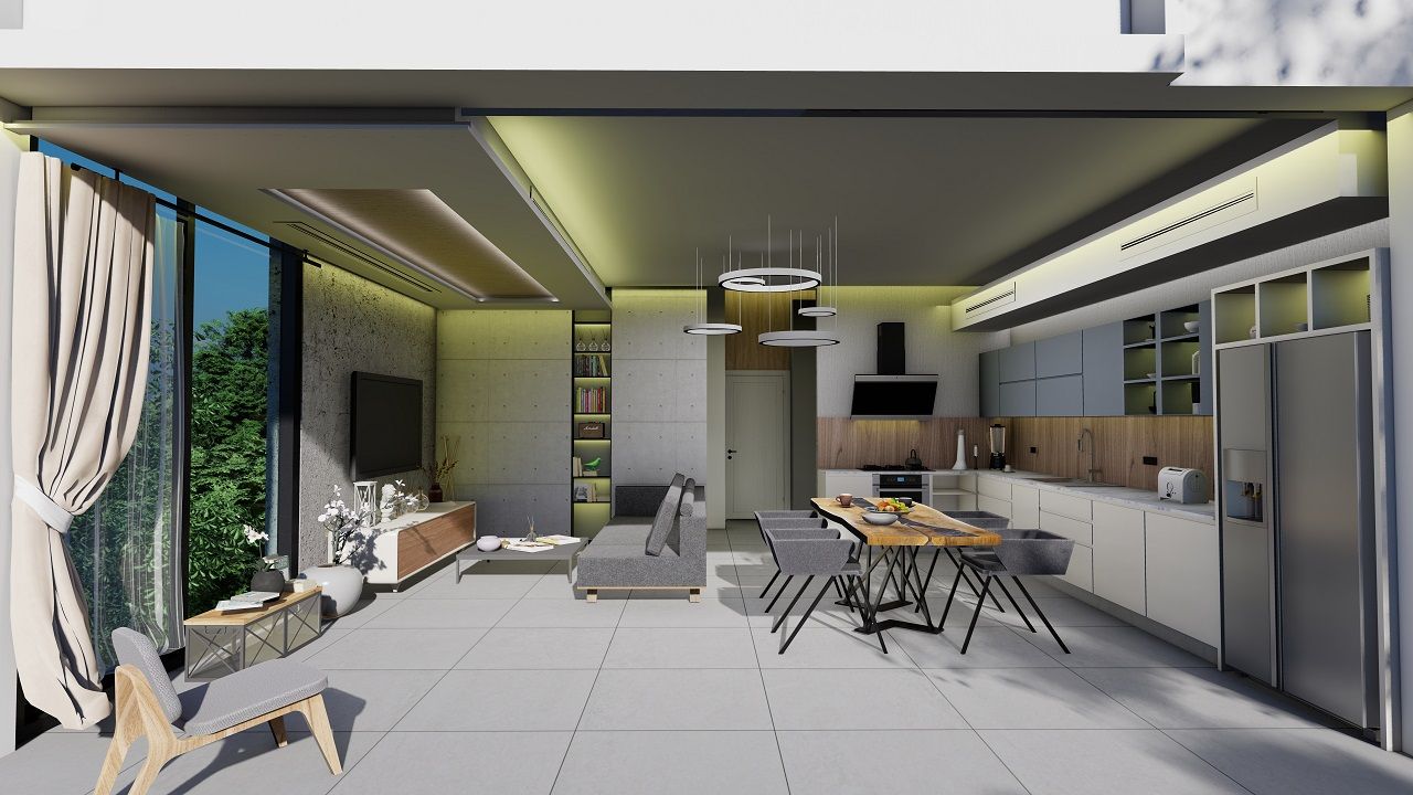 - آشپزخانه باز با مبلمان داخلی